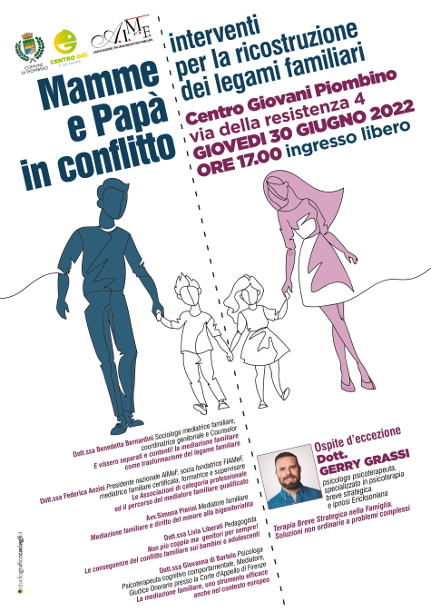 Giovedì 30 giugno alle 17 al Centro Giovani si terrà " Mamme e Papà in conflitto, interventi per la ricostruzione dei legami familiari " il convegno, organizzato da Aimef , associazione italiana Mediatori Familiari e dal Comune di Piombino, sul tema della mediazione familiare: ospite dell’evento Dott. Gerry Grassi, psicologo psicoterapeuta specializzato in psicoterapia breve strategica e ipnosi Ericksoniana.