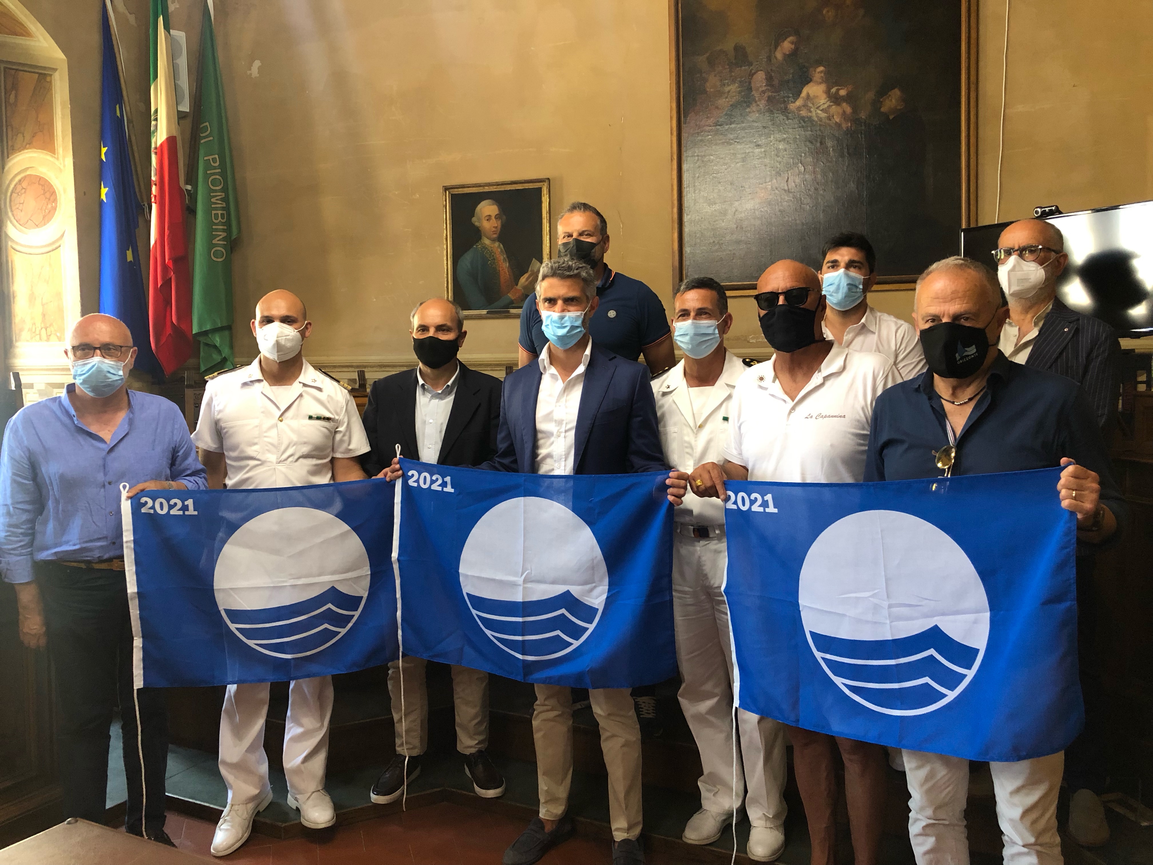 Si è tenuta oggi, lunedì 5 luglio, nella sala consiliare del Comune di Piombino, la cerimonia di consegna della Bandiera Blu. Erano presenti il sindaco Francesco Ferrari, il responsabile dell’Ufficio Territoriale dell’Autorità di sistema portuale Claudio Capuano, il comandante della Capitaneria di Porto di Piombino Valerio Chessari ed il presidente del Consorzio balneare costa est, Fabrizio Lotti.