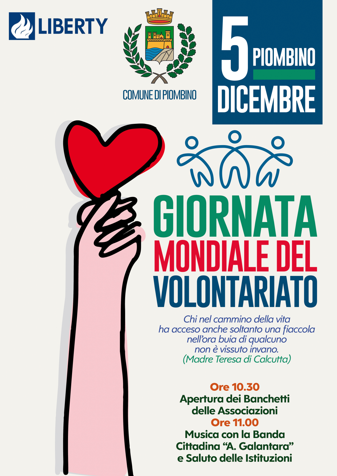 La giornata rappresenta un momento di ringraziamento e valorizzazione delle attività messe in campo da tutti volontari, animati da un profondo spirito di condivisione e solidarietà: Chi nel cammino della vita ha acceso anche soltanto una fiaccola nell’ora buia di qualcuno non è vissuto invano, disse Madre Teresa di Calcutta e in tal senso le sue parole suonano quantomai indicate a descrivere la preziosità del lavoro delle associazioni. I piombinesi sono da sempre impegnati nel volontariato, attività che, oltre a dimostrare la virtù e il grandissimo senso civico dei cittadini, contribuiscono a mantenere unito il tessuto sociale. Questa giornata sarà quindi un momento di ringraziamento e valorizzazione dell’importante lavoro messo in campo da tutti volontari.”
