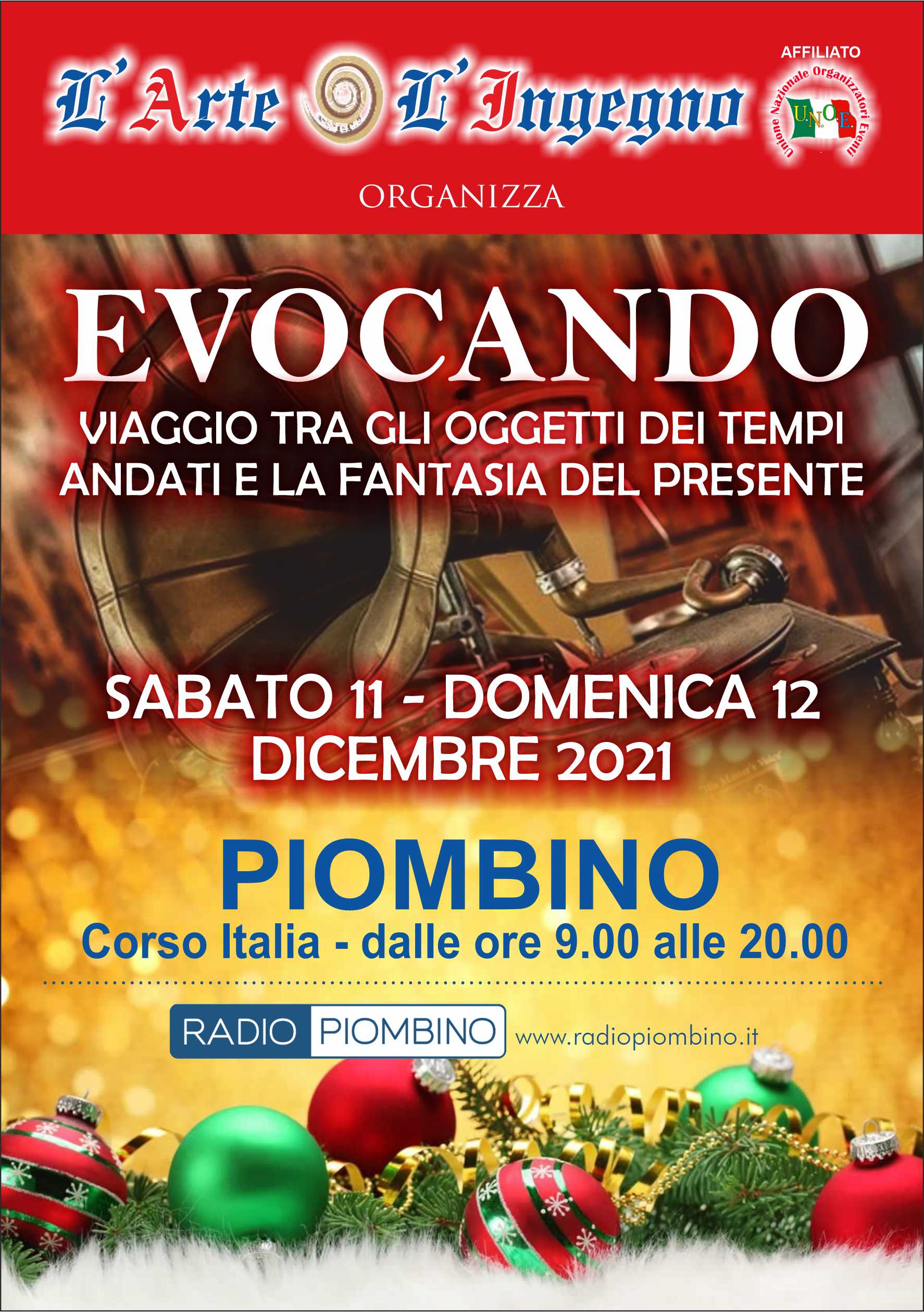Sabato 11 e domenica 12 dicembre il mercatino dell’artigianato di Evocando torna a Piombino con stand, banchetti, oggettistica e molto altro ancora dalle 9 alle 20 in corso Italia. Come sempre, l'offerta dei prodotti in vendita riguarderà esclusivamente produzioni artigianali, opere del proprio ingegno, articoli di modernariato, collezionismo, rigatteria e antiquariato.