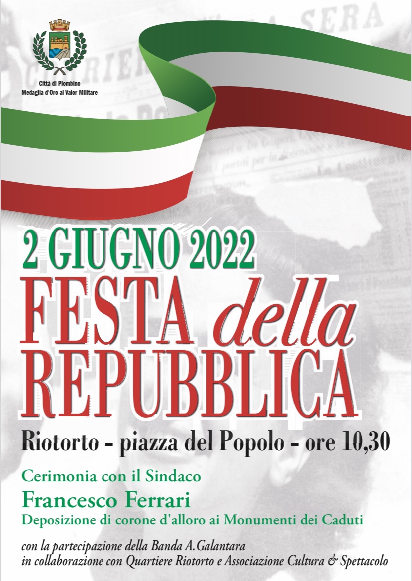 Giovedì 2 giugno alle 10.30 a Riotorto si svolgerà la celebrazione istituzionale in occasione del 76esimo anniversario della Repubblica. La cerimonia avrà luogo di fronte ai monumenti in via delle Scuole e tra la piazza centrale e via De Amicis, dove saranno benedette e deposte le Corone di alloro per rendere i dovuti onori ai Caduti.