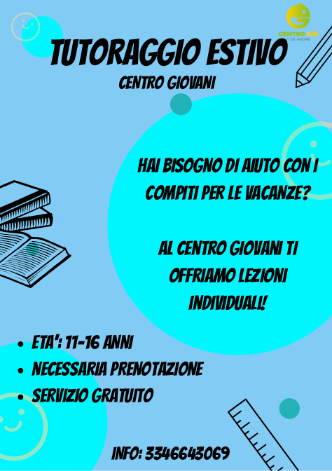 Parte il servizio gratuito di tutoraggio estivo al Centro giovani per i ragazzi dagli 11 ai 16 anni che hanno bisogno di sostegno e supporto nello svolgimento dei compiti estivi: gli studenti saranno seguiti con lezioni individuali.
