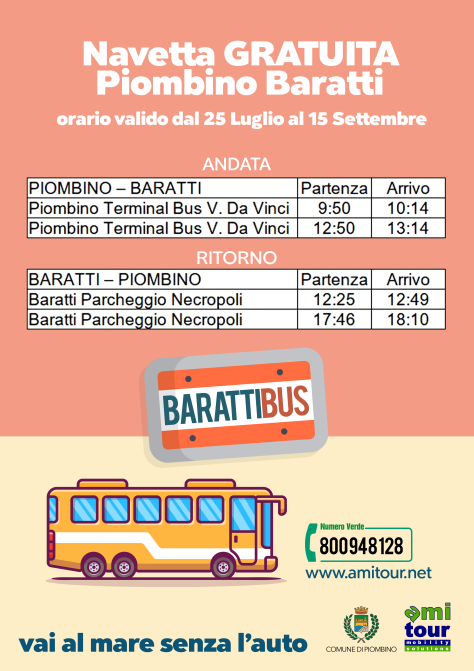 È partito lunedì 25 luglio, grazie all’accordo con Amitour Service, un nuovo servizio navette andata e ritorno che collegherà Baratti a Piombino: il bus è gratuito e svolgerà il servizio tutti i giorni nel periodo da lunedì 25 luglio a giovedì 15 settembre.