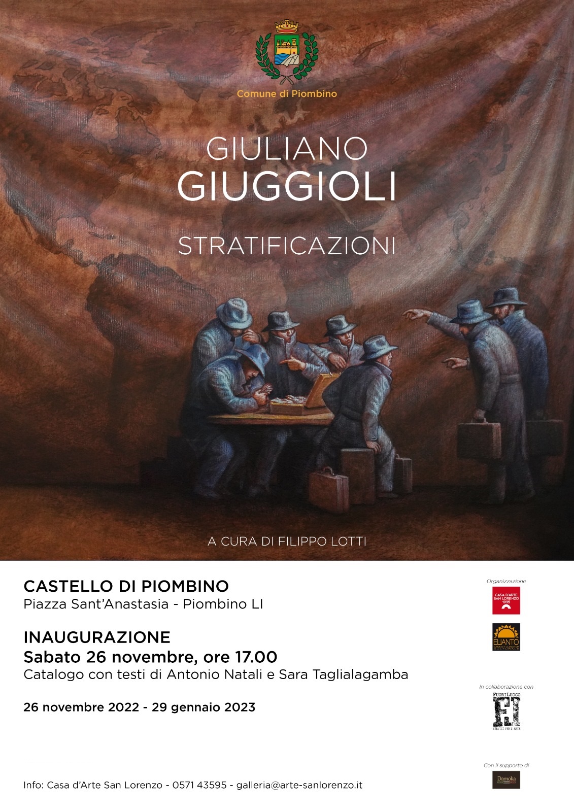 Sarà inaugurata sabato 26 novembre alle ore 17 al Castello di Piombino la mostra dell’artista Giuliano Giuggioli, intitolata “Stratificazioni”, curata da Filippo Lotti. Per omaggiare la città Giuggioli ha creato alcune opere dedicate proprio a Piombino, che saranno esposte per la prima volta in questa occasione.