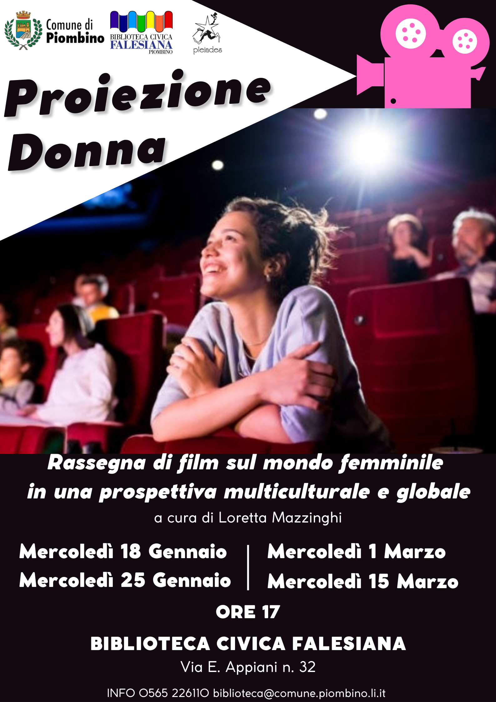 La rassegna prevede quattro appuntamenti alle ore 17,00 ad ingresso gratuito presso la Biblioteca civica Falesiana: mercoledì 18 gennaio, mercoledì 25 gennaio, mercoledì 1 marzo e mercoledì 15 marzo. Le proiezioni saranno precedute da una breve introduzione a cura di Loretta Mazzinghi