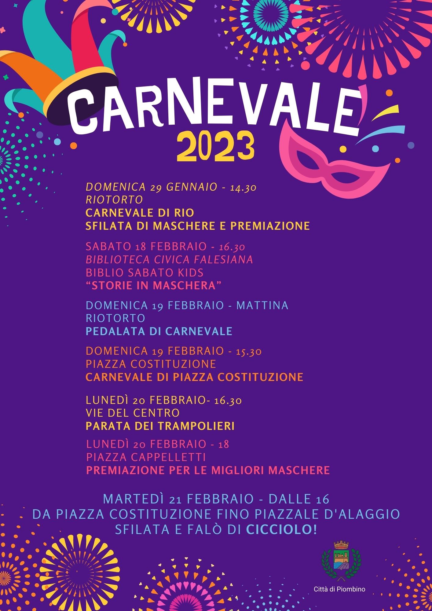 Sabato 18 febbraio alle 16.30 per Biblio Sabato kids in programma le “Storie in Maschera”, alla Biblioteca Civica Falesiana. domenica 19 febbraio alle 9.30 invece ci sarà a Riotorto la pedalata di Carnevale, proposta dalla U.C. Riotorto.