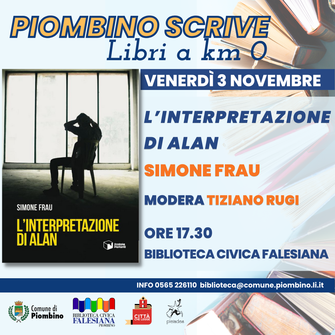 La Biblioteca civica Falesiana, Via E.Appiani n.32 Piombino, ospiterà il 3 novembre alle ore 17,30 la presentazione del volume L’interpretazione di Alan di Simone Frau, introduce il giornalista Tiziano Rugi.