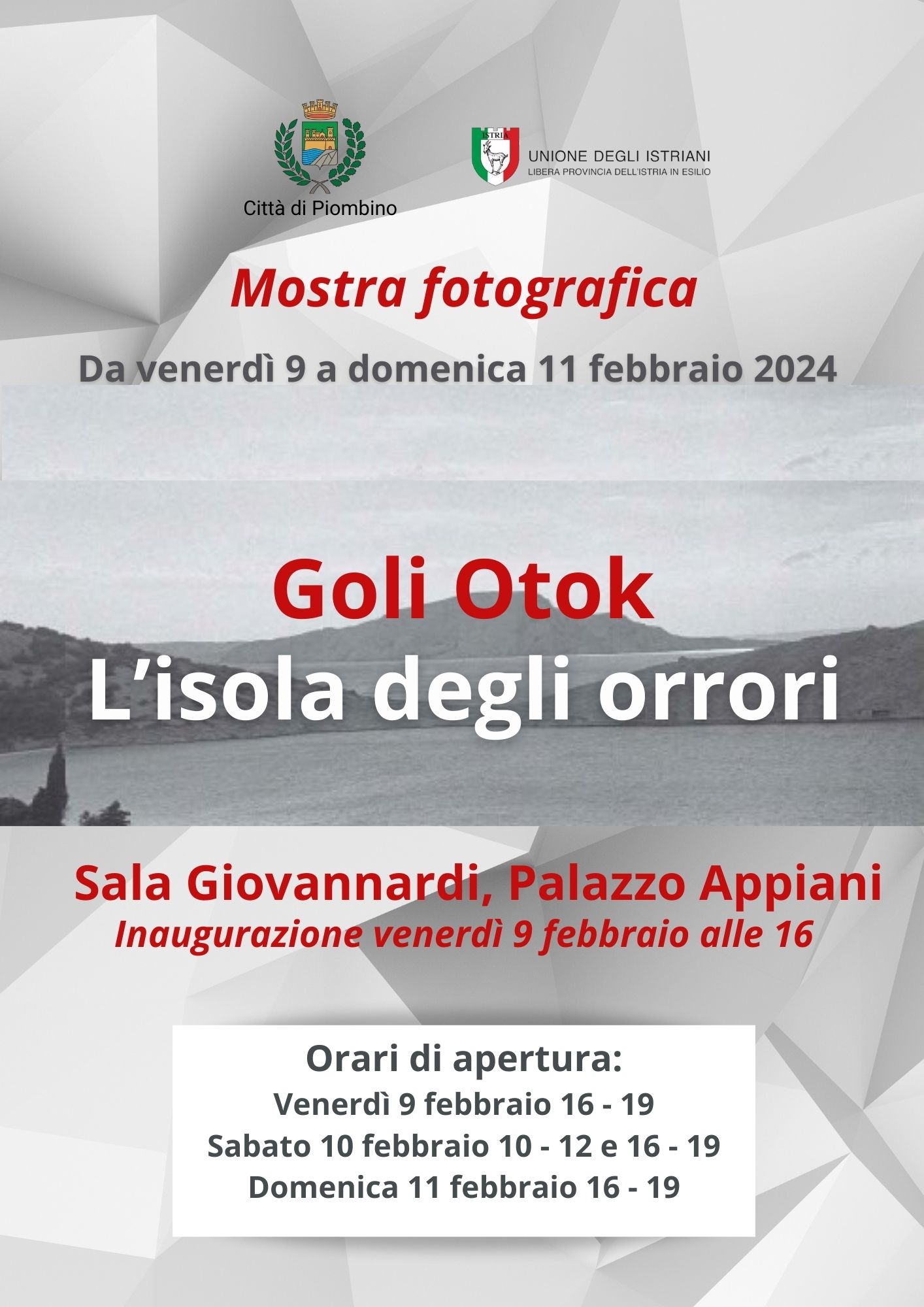 In occasione della ricorrenza del Giorno del Ricordo, dedicata alla tragedia degli italiani, di tutte le vittime delle foibe e dell'esodo dalle loro terre degli istriani, fiumani e dalmati, il Comune di Piombino organizza la Mostra "Goli Otok, l'isola degli orrori", a cura dell'Unione degli Istriani, sul lager che le milizie di Tito avevano messo in piedi su un isolotto croato, l'isola Calva (Goli Otok), tristemente celebre per gli episodi efferati che vi sono avvenuti.