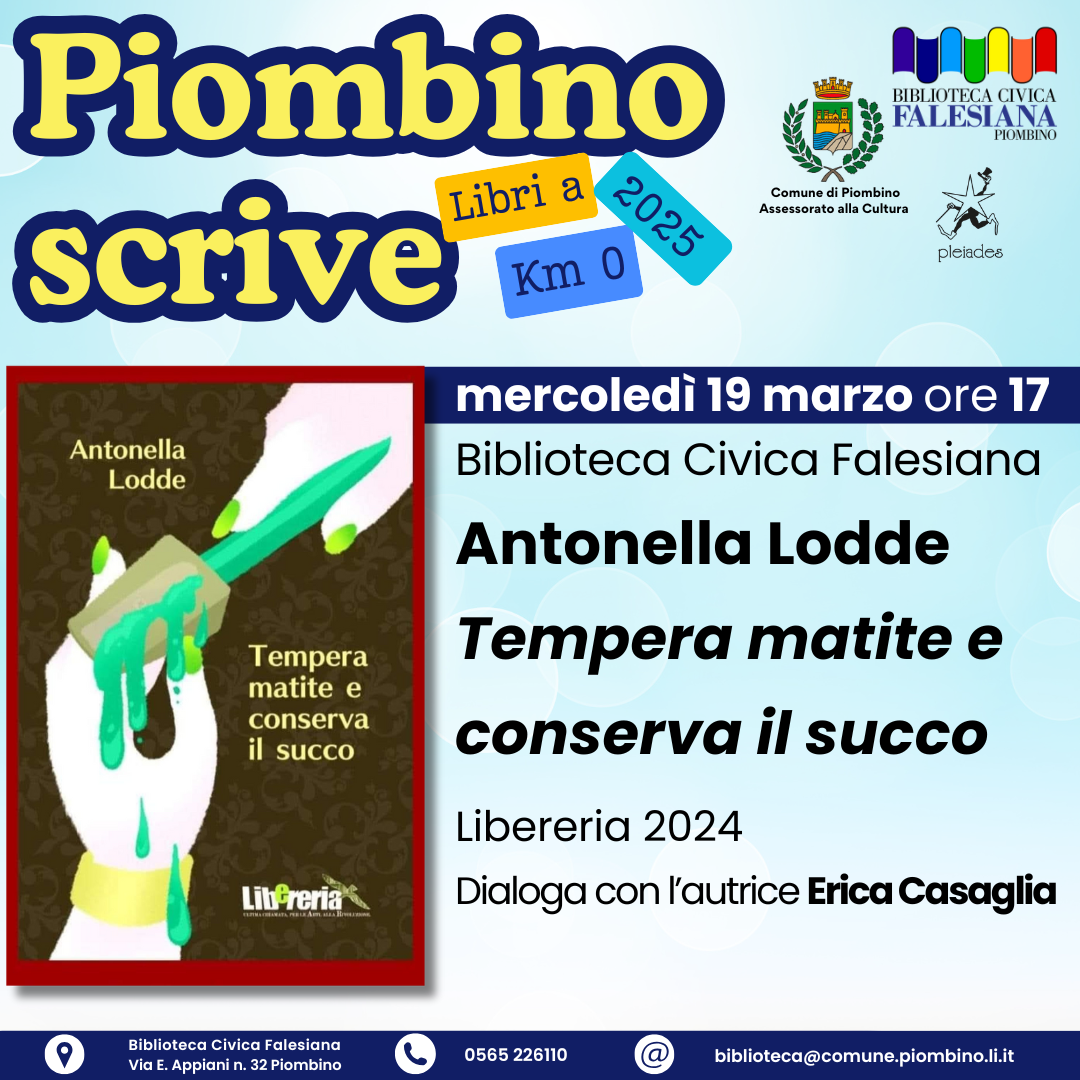 Prosegue “Piombino Scrive: libri a KM 0!”, la rassegna dedicata a Piombino e al suo territorio per dare il giusto spazio e visibilità a chi nella nostra città si dedica alla scrittura e pubblica libri; organizzata dall'Assessorato alla Cultura del Comune di Piombino e dalla Biblioteca civica Falesiana, "Piombino scrive" vuole essere non solo una finestra per gli autori locali, ma per tutti coloro che hanno scritto libri sul nostro territorio. Un’opportunità per far conoscere al pubblico piombinese la produzione letteraria locale costruendo un rapporto diretto con gli utenti della biblioteca e offrire occasione di incontro e conoscenza.