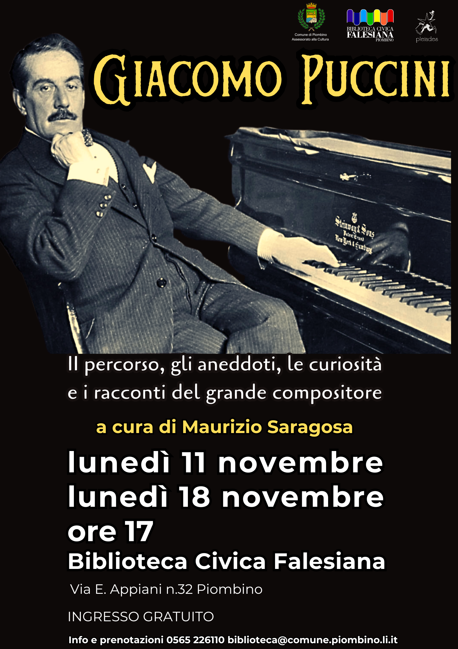 Lunedì 11 novembre e lunedì 18 novembre la Biblioteca Civica Falesiana del Comune di Piombino organizza due incontri per ricordare il celebre compositore Giacomo Puccini, in occasione del centenario della sua morte. Gli appuntamenti, a cura di Maurizio Saragosa, direttore di orchestra e compositore, saranno dedicati in modo particolare a due opere la cui visione, accompagnata dalla sapiente guida del curatore, permetterà di cogliere la grandezza musicale di uno dei compositori italiani più amati.