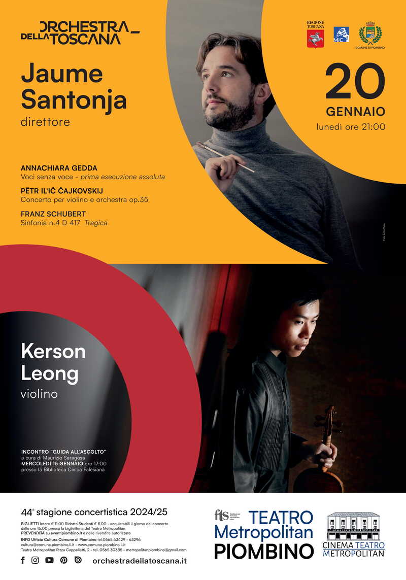 Si tratta di uno dei concerti più travolgenti del repertorio per violino: il pezzo forte del programma è affidato allo spagnolo Jaume Santonja, direttore principale ospite dell’Orchestra Sinfonica di Milano, che torna sul podio dell’ORT dopo due anni portando a Piombino il Concerto op. 35 di Pëtr Il'ič Čajkovskij, una composizione del 1878 di inventiva melodica generosissima, sgargiante nell’orchestrazione, pervasa da capo a fondo di lirismo intenso e che per giunta contiene passi tra i più difficili e spettacolari del violinismo ottocentesco, cosicché offre al solista parecchie occasioni per mettere in mostra le sue capacità tecniche.