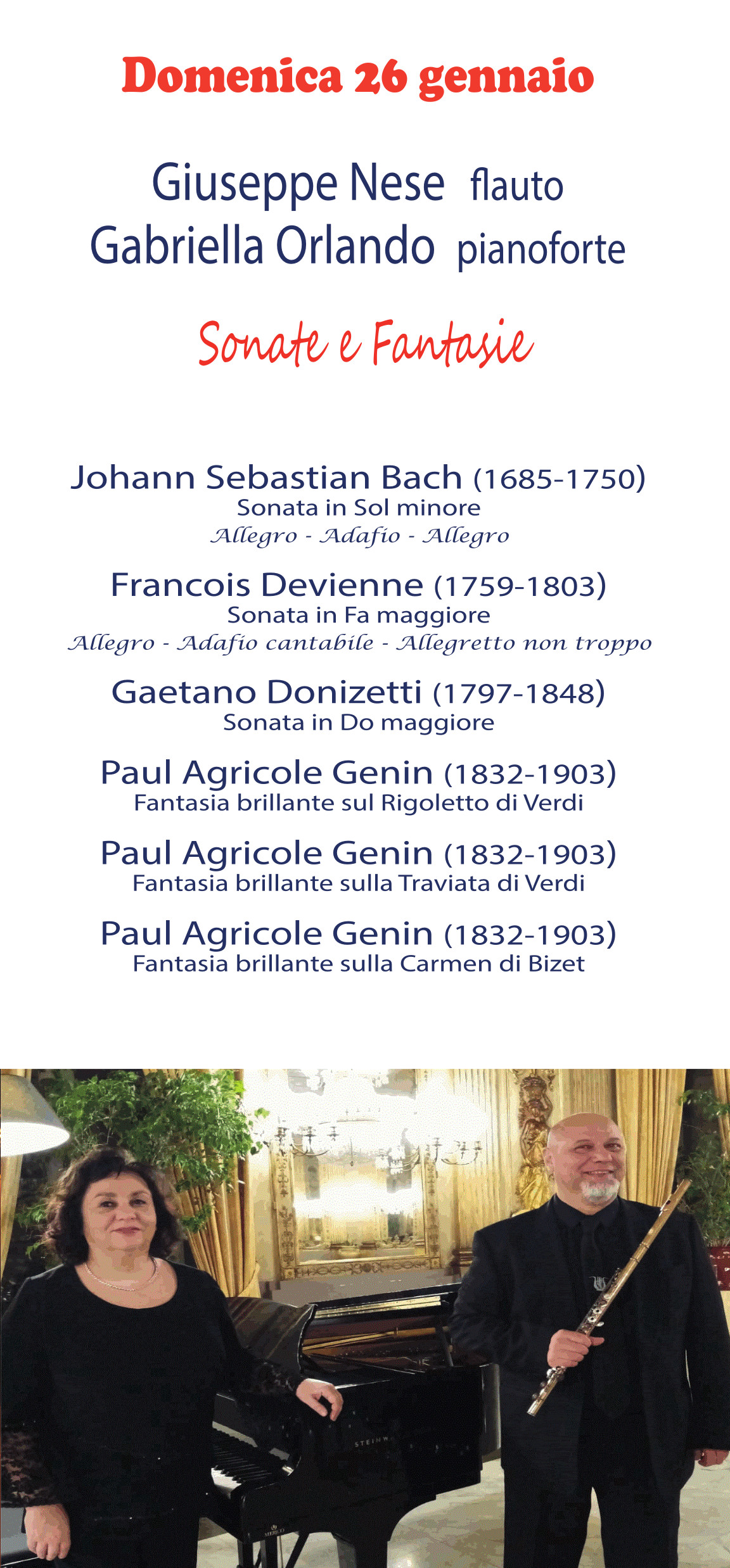 Dopo il successo dei primi due eventi, domenica 26 gennaio si terrà il terzo e ultimo evento della rassegna Domeniche in musica organizzata dall’associazione culturale Etruria classica con la collaborazione del Comune. Questa volta il palco è affidato al duo formato dal flautista Giuseppe Nese e dalla pianista Gabriella Orlando. In programma musiche di Bach, Devienne, Donizetti e Genin.