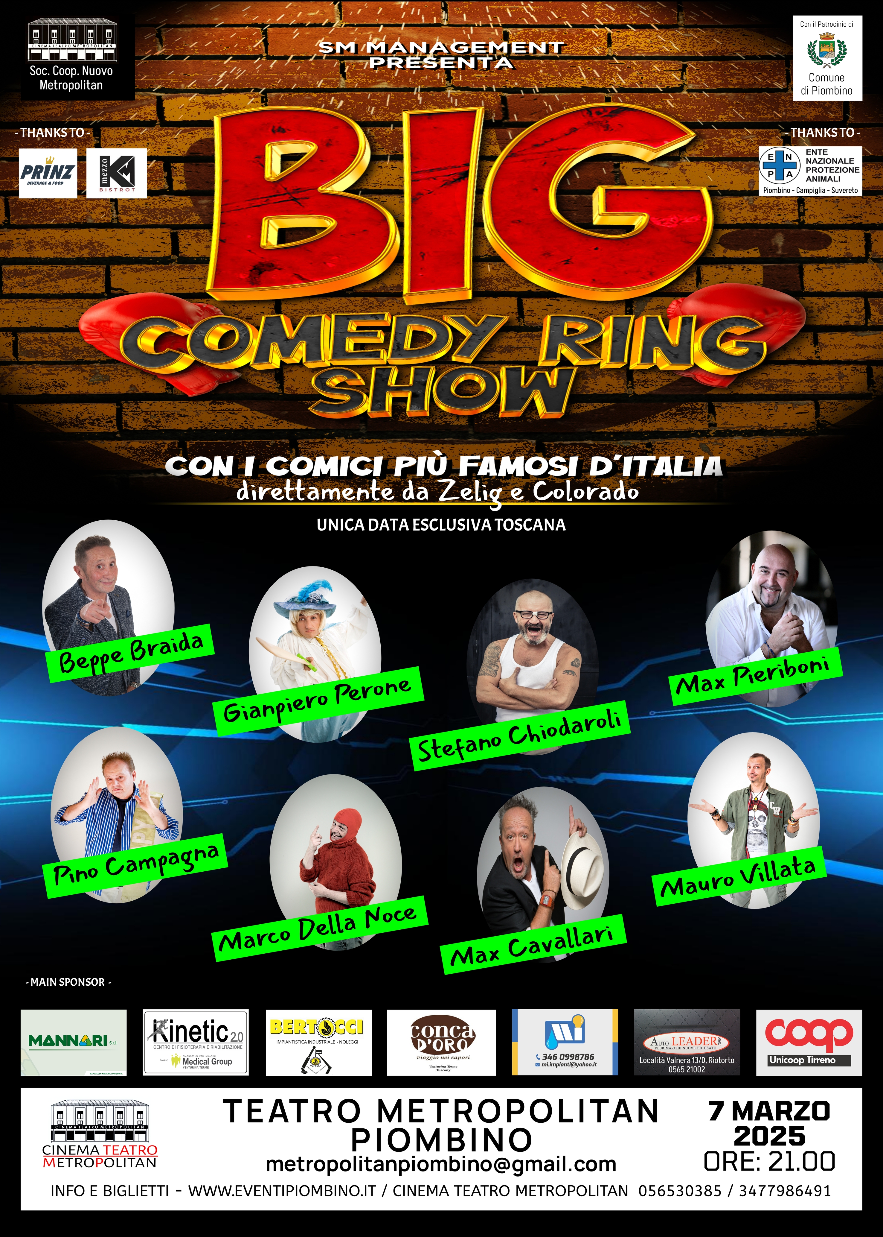 Venerdì 7 marzo in scena al Metropolitan Big Comedy Ring Show, un format originale della SM Management in cui i migliori comici di Zelig e Colorado si sfidano sul palco per vincere la