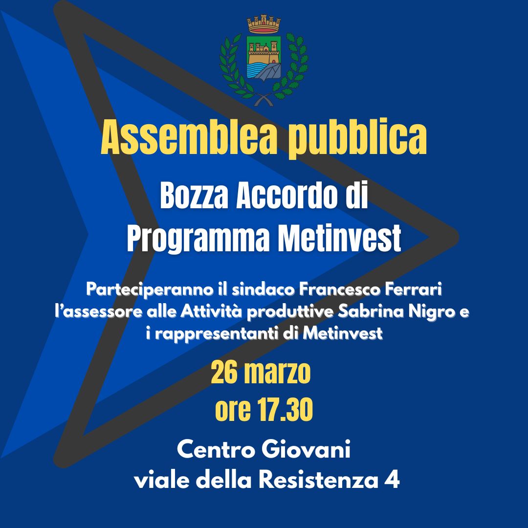 Il Comune di Piombino rinnova l’invito ai cittadini a partecipare all’assemblea pubblica dedicata all’Accordo di Programma con il gruppo Metinvest Adria, in programma per mercoledì 26 marzo alle ore 17.30 al Centro Giovani.