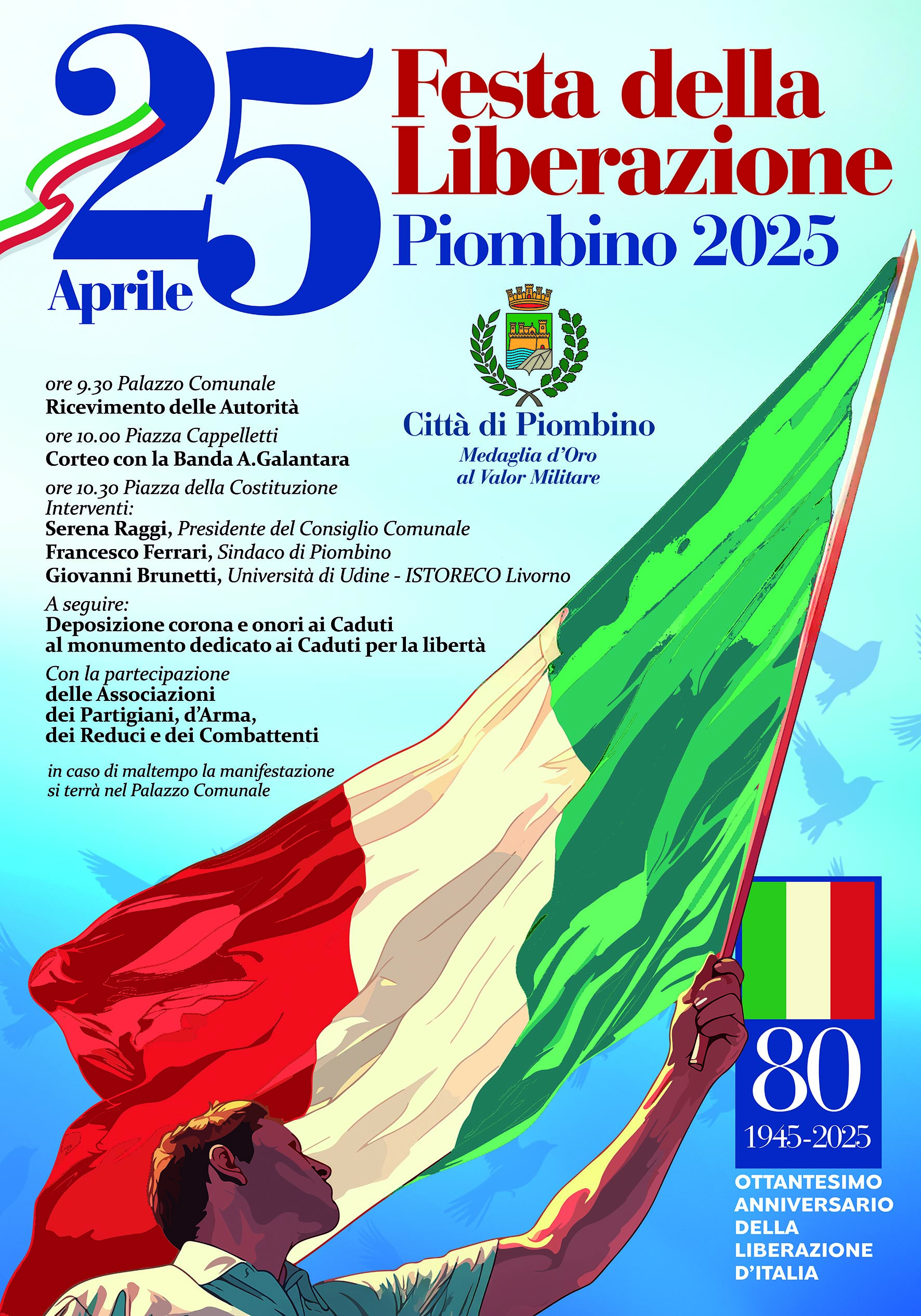 Alle 10.30 nell’area anfiteatro della piazza sarà la volta degli interventi: prenderanno la parola il presidente del Consiglio comunale Serena Raggi, il sindaco di Piombino Francesco Ferrari e Giovanni Brunetti, docente a contratto all’Università di Udine e ricercatore presso l’Istituto Storico della Resistenza e dell’Età Contemporanea di Livorno. La deposizione della corona e gli onori ai caduti al Monumento dedicato ai Caduti per la Libertà concluderanno la cerimonia. La celebrazione è organizzata con la partecipazione delle Associazioni dei Partigiani, d’Arma e dei Reduci e dei Combattenti. In caso di maltempo, l’evento si svolgerà nella sala Consiliare del Palazzo Comunale.