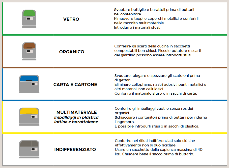 Di seguito le regole per il corretto conferimento delle diverse frazioni di rifiuto urbano all’interno degli specifici contenitori stradali.