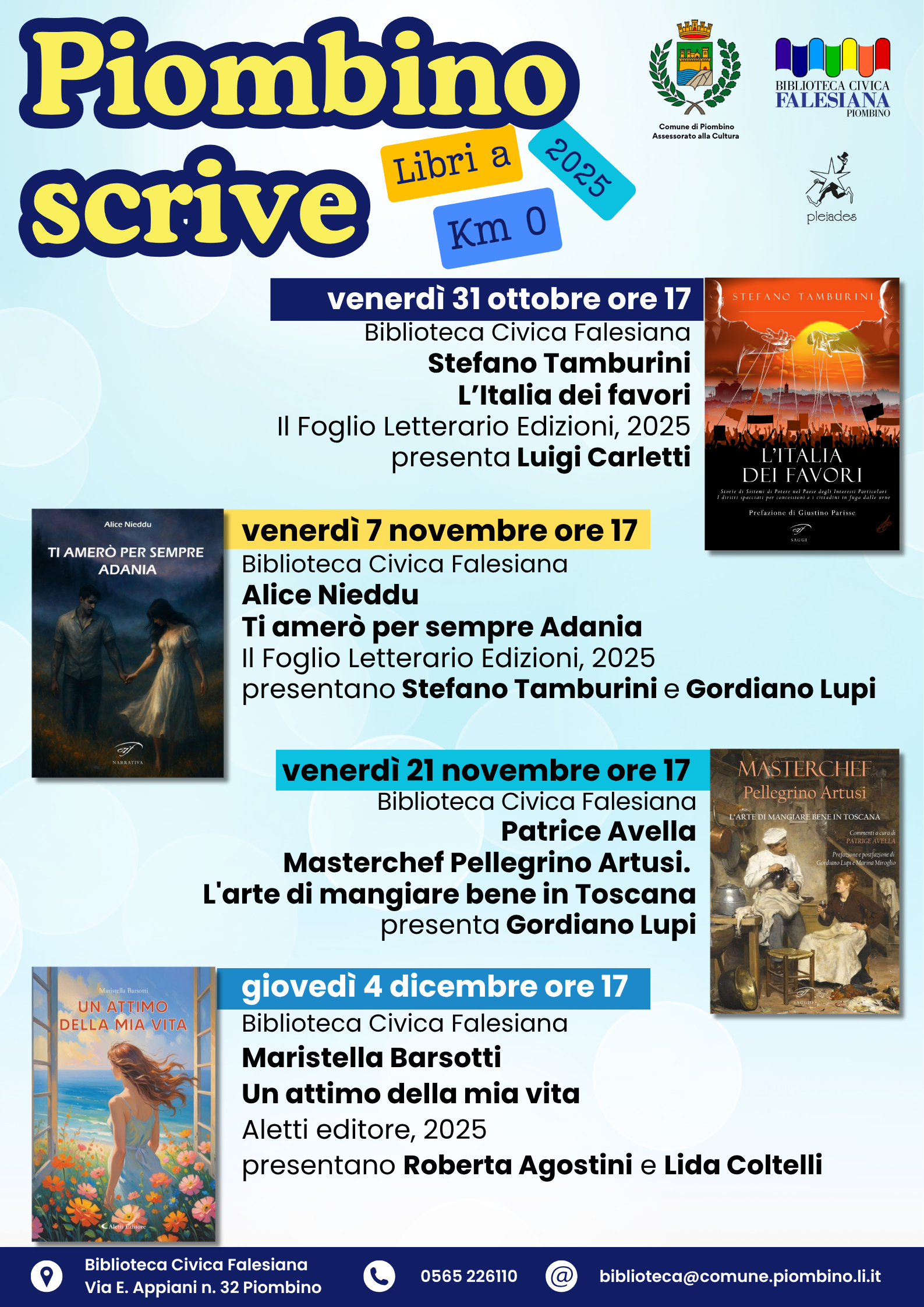 Nel mese di ottobre hanno inizio i nuovi appuntamenti “Piombino Scrive: libri a KM 0!”, la rassegna dedicata a Piombino e al suo territorio; organizzata dall'Assessorato alla Cultura del Comune di Piombino e dalla Biblioteca civica Falesiana, "Piombino scrive" vuole essere non solo una finestra per gli autori locali, ma per tutti coloro che hanno scritto libri sul nostro territorio. Un’opportunità per far conoscere al pubblico piombinese la produzione letteraria locale costruendo un rapporto diretto con gli utenti della biblioteca e offrire occasione di incontro e conoscenza.