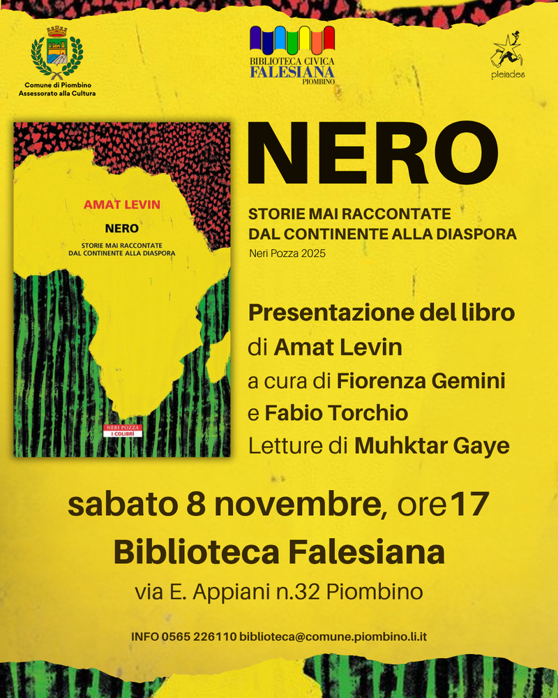 Sabato 8 novembre, alle ore 17 in Biblioteca si terrà la presentazione, a cura di Fiorenza Gemini, ex funzionaria del Ministero della Cultura e Fabio Torchio, storico dell'arte della Soprintendenza bsae di Siena, con le letture di Muhktar Gaye, del libro di Amat Levin "Nero. Storie mai raccontate dal Continente alla diaspora", pubblicato da Neri Pozza nel 2025. Secoli di colonialismo l’hanno resa irrilevante, studiosi superficiali ne hanno negato l’antichità, pregiudizi razzisti decretato l’inesistenza: la storia africana ha sempre avuto, per usare un eufemismo, scarsissimi sostenitori. Fino alla metà XX secolo non è stato fatto alcun tentativo di studiarla: si preferiva considerare l’Africa un insieme eterogeneo di stili di vita barbari che l’Occidente si era lasciato alle spalle, uno “spazio vuoto” che aveva acquistato vita solo con l’arrivo dell’uomo bianco. Quando finalmente si cominciò a frequentarla, gli storici si concentrarono solo sul periodo coloniale, per mancanza di fonti autoctone o per l’impossibilità di unificare in un quadro esaustivo elementi tanto diversi tra loro, polverizzati in una massiccia migrazione, violenta e forzata, una diaspora immensa. Ma qualcosa accomuna tutti quegli elementi: appartengono a popolazioni dalla pelle nera e sono stati sistematicamente ignorati. È proprio ai neri, in Africa o lontano dal continente, che Amat Levin dedica dunque questo libro: a coloro le cui storie, vicende e identità brillano per l’assenza dalla storiografia ufficiale.