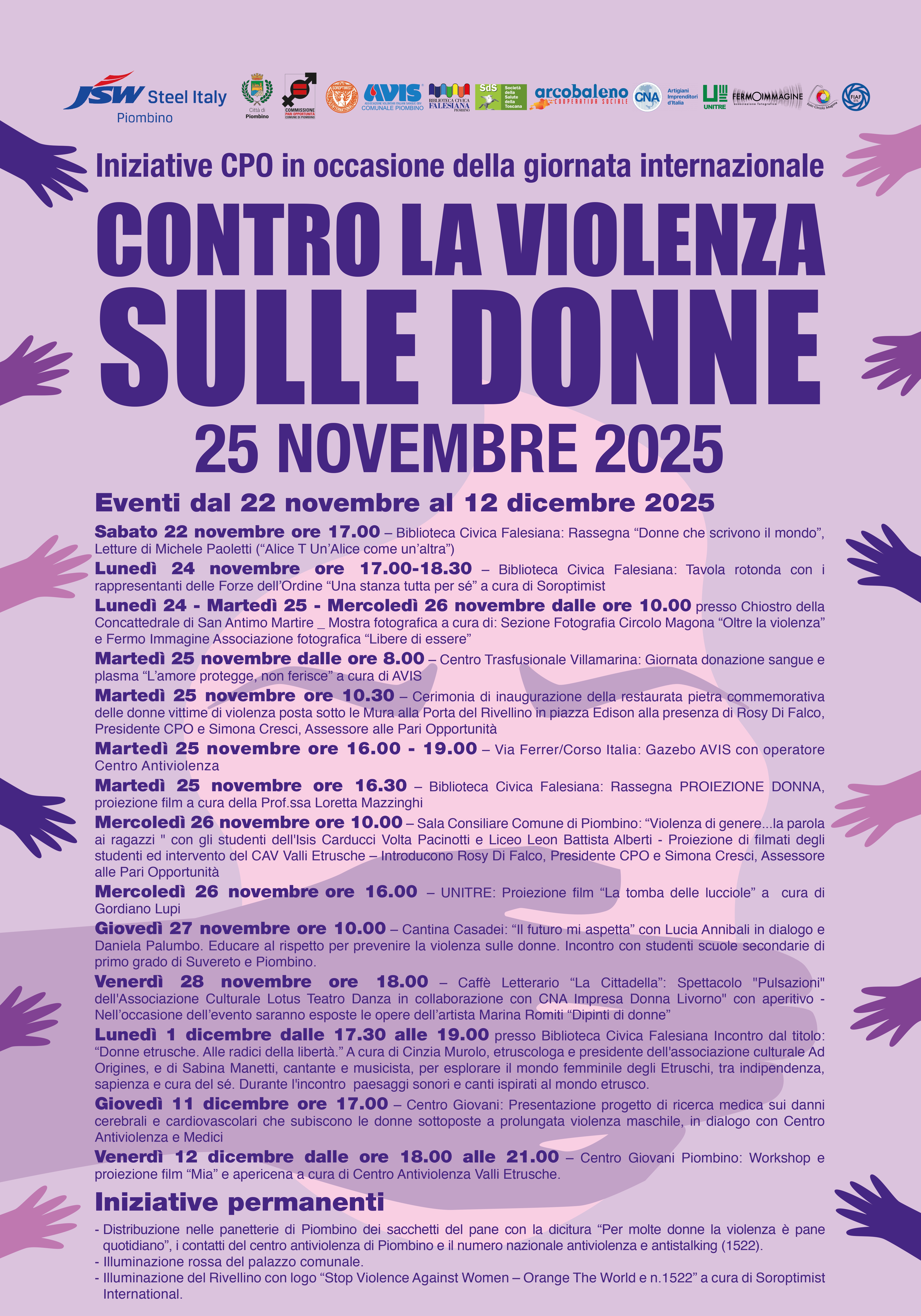 Le iniziative proseguiranno mercoledì 26 novembre, alle 10, nella Sala consiliare del Comune di Piombino, con l’incontro “Violenza di genere... la parola ai ragazzi”, che coinvolgerà gli studenti dell’Isis Carducci Volta Pacinotti e del Liceo Leon Battista Alberti. Nel pomeriggio, alle 16, l’UNITRE proporrà la proiezione del film “La tomba delle lucciole”.